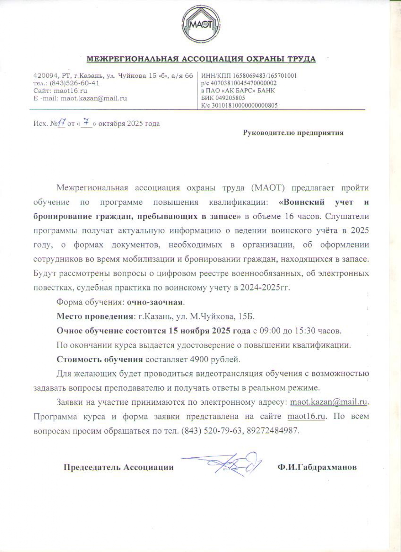 Межрегиональная ассоциация охраны труда (МАОТ) предлагает пройти обучение по программе повышения квалификации: «Воинский учет и бронирование граждан, пребывающих в запасе» в объеме 16 часов.